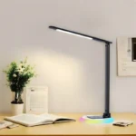This flicker-free LED desk lamp features an eye-friendly light panel, USB charging port, touch controls, timer function, and sleek aluminum frame—perfect for reading, studying, or working while protecting your eyes and saving energy.