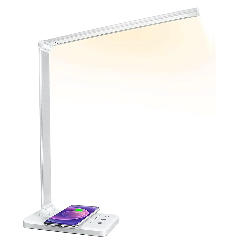 Modern LED desk lamp with 10W wireless charging, USB port, 50 lighting settings, and eye-care light. Features foldable design, auto timer, and long lifespan. Ideal for offices, bedrooms, and study spaces. Energy-efficient and easy to use.